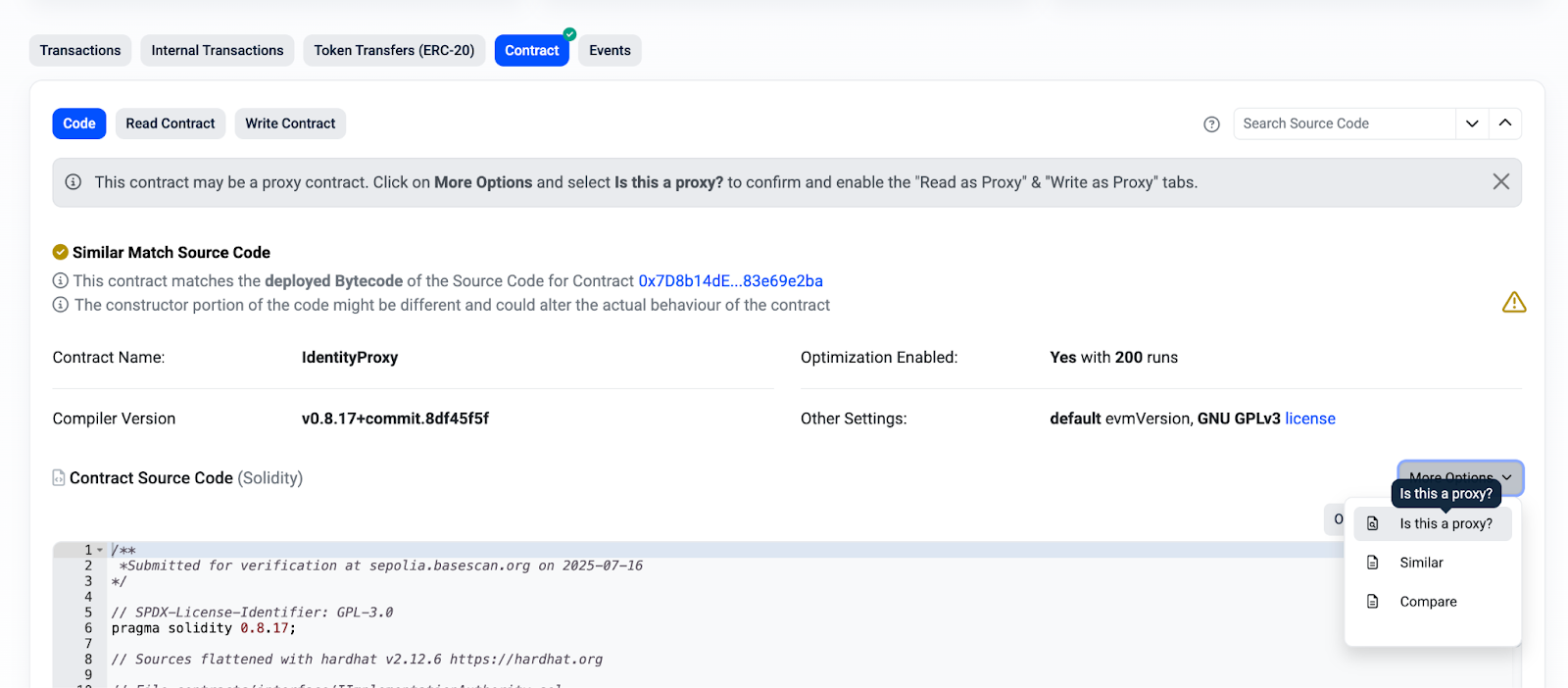 - In the contract tab, select the Is this a Proxy? option