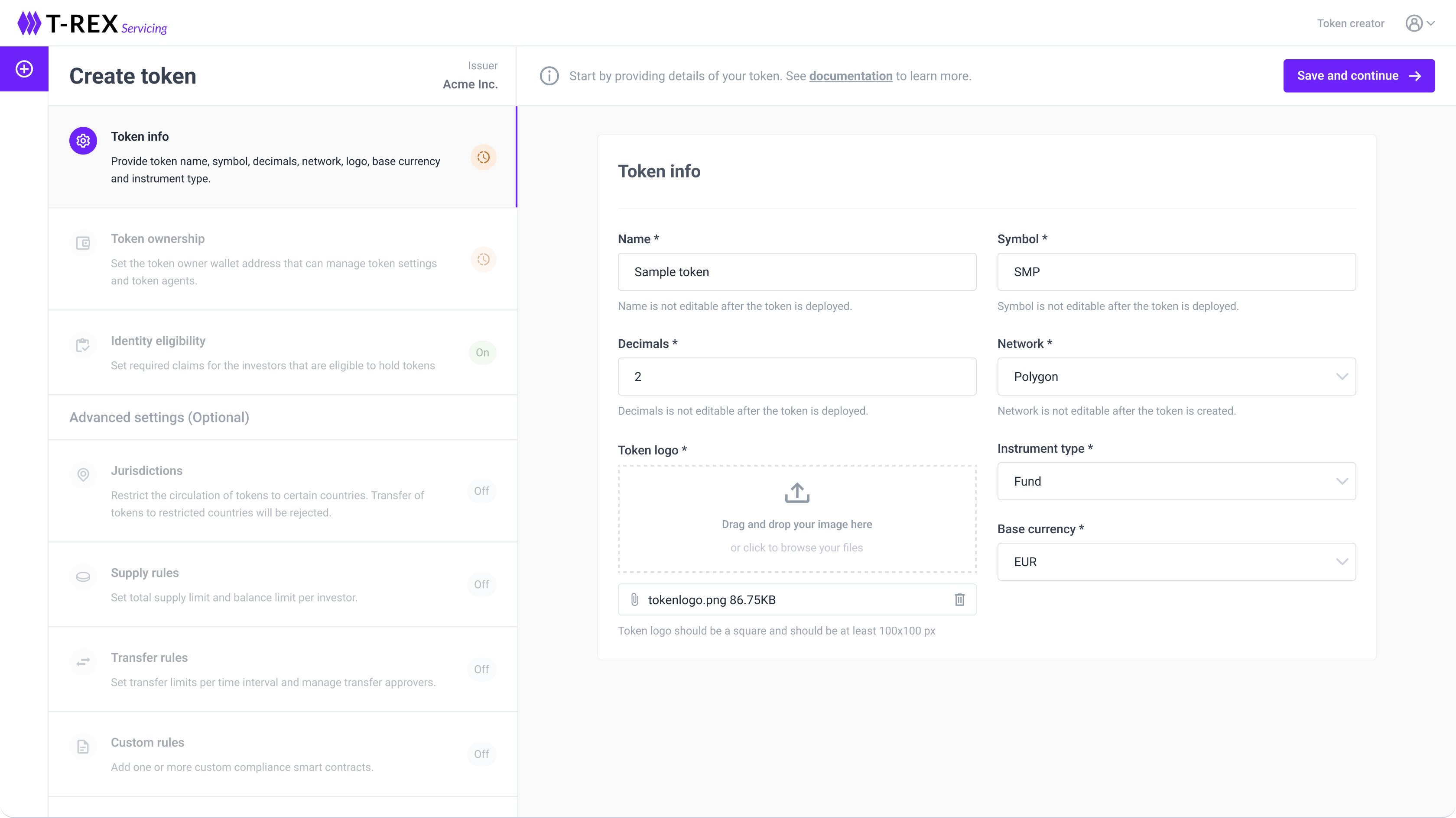 You can easily manage the fundamental characteristics of your token, including its name, symbol, base currency, instrument type, and logo. These details are pivotal in establishing your token’s identity, usability, and market recognition. Key functionalities include: