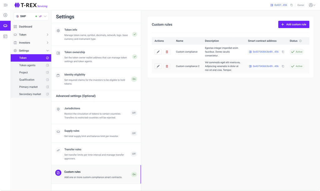 - Smart Contract Address: Once added, the smart contract address serves as the immutable identifier for each custom compliance rule. This address is not editable, ensuring the integrity and security of the compliance framework.