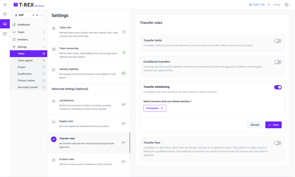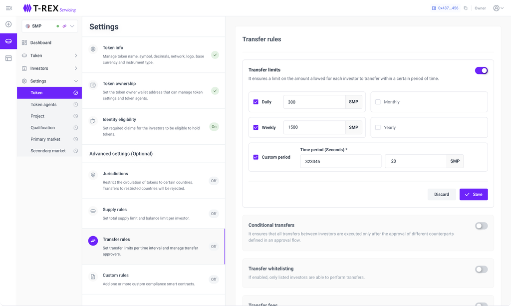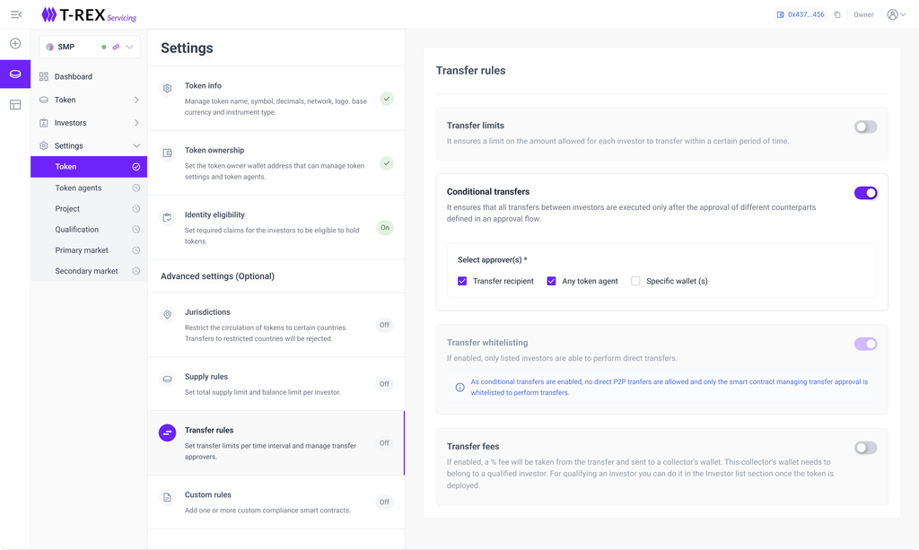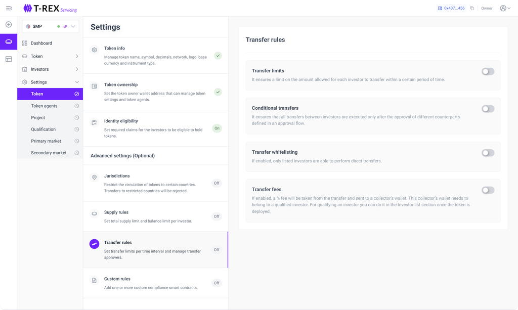 Any transfer rule can be applied to tokens, defining when and how they can be transferred to ensure automation and compliance. This section highlights the rules available on our platform for direct setup, including transfer limitations, conditional transfers, transfer whitelists, and transfer fees. Additionally, any custom rules can be added to meet different needs of business cases, as you will explore in Section 7.