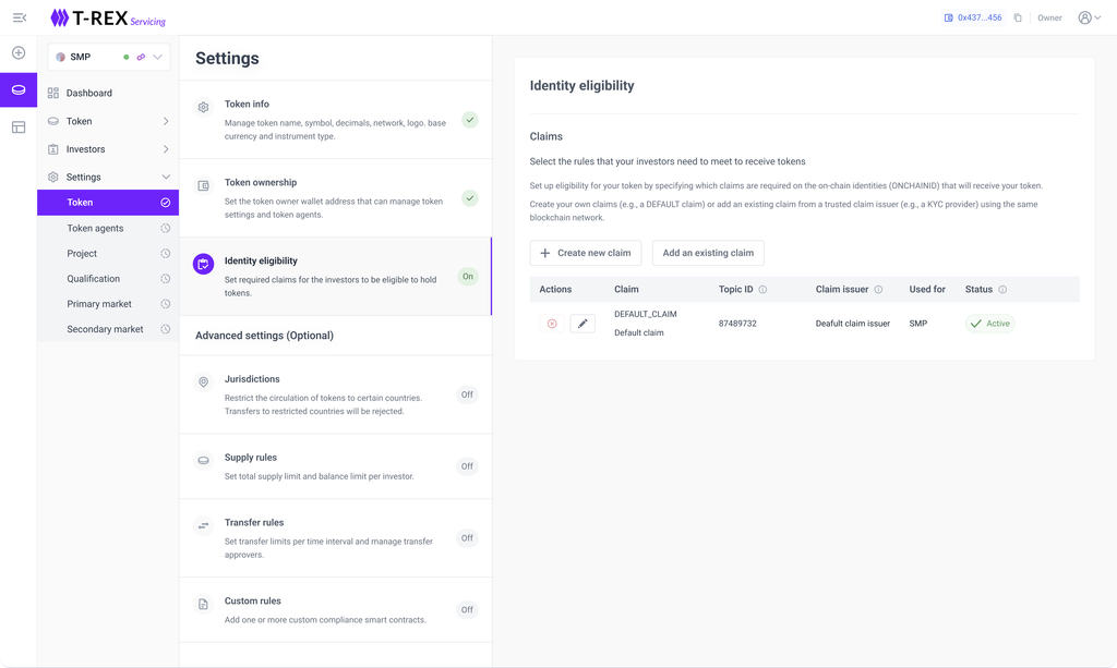 Here you configure eligibility for your token by defining which claims are expected to be found on the onchain identities (ONCHAINID) that will receive your token. These claims will match the ones to be issued to those onchain identities when qualifying an investor.