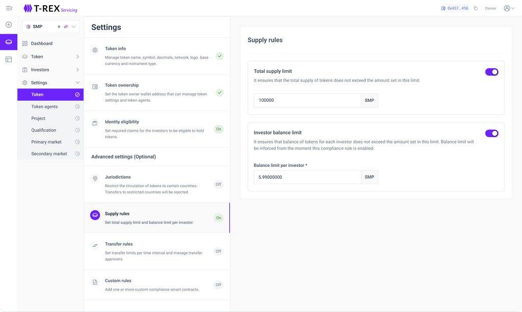 - Investor Balance Limit: The Balance Limit per Investor feature restricts the maximum number of tokens that any single investor can hold. This rule is vital for ensuring a fair distribution of tokens among investors and for preventing excessive concentration of token ownership.