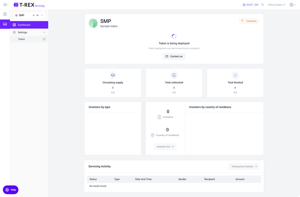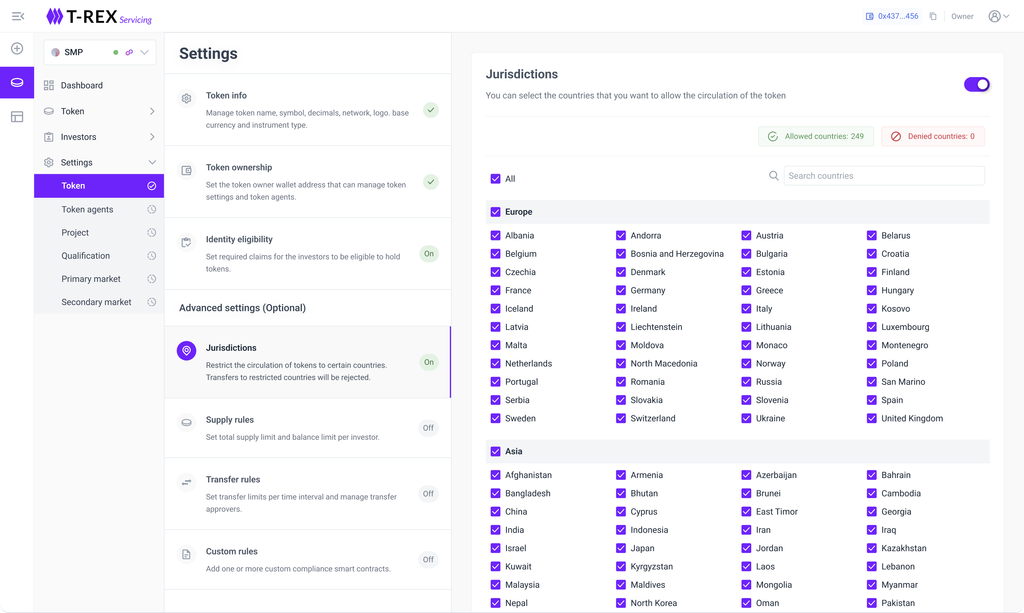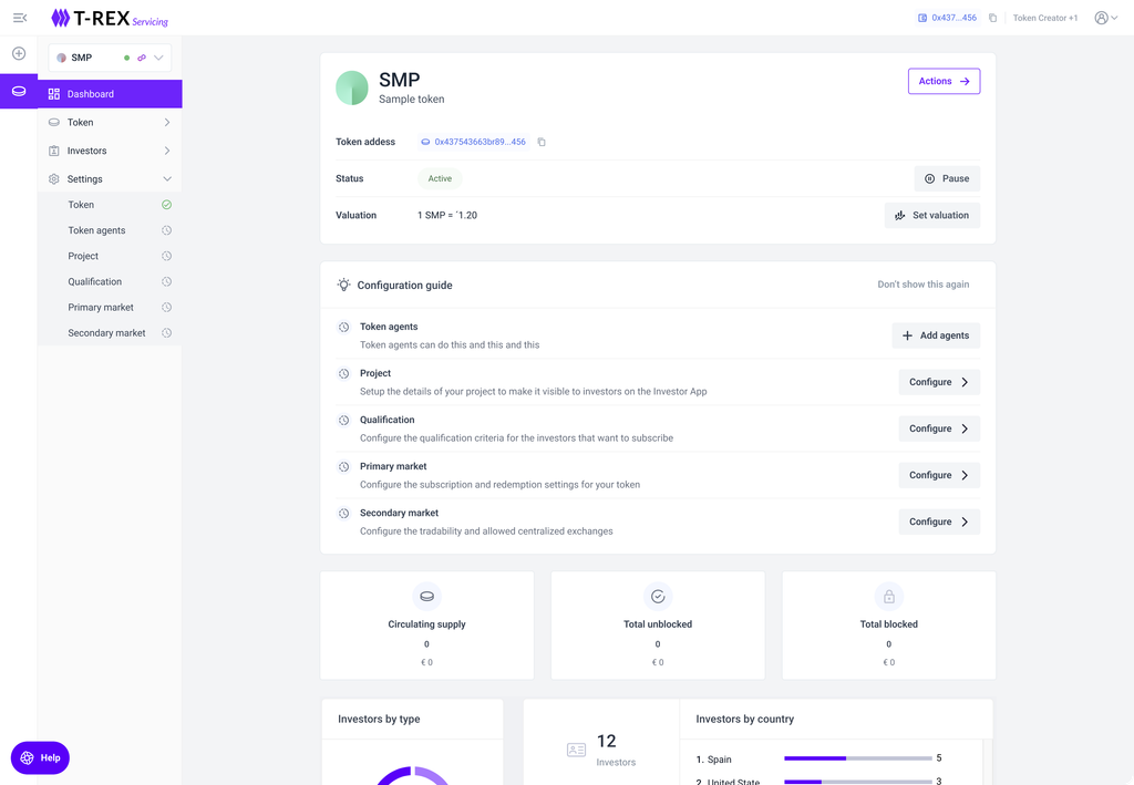After deployment, the issuer is redirected to an intuitive dashboard where they can monitor key metrics and performance indicators. You also have a Configuration guide here, where you can easily access to the next steps needed to configure your token, add token agents, create projects, and access to configure primary and secondary market. As mentioned earlier in the article, once the token is deployed, you can effortlessly modify compliance rules without the need to redeploy or migrate the smart contract. This flexibility ensures agility, allowing you to quickly adapt to the ever-changing regulatory landscape.