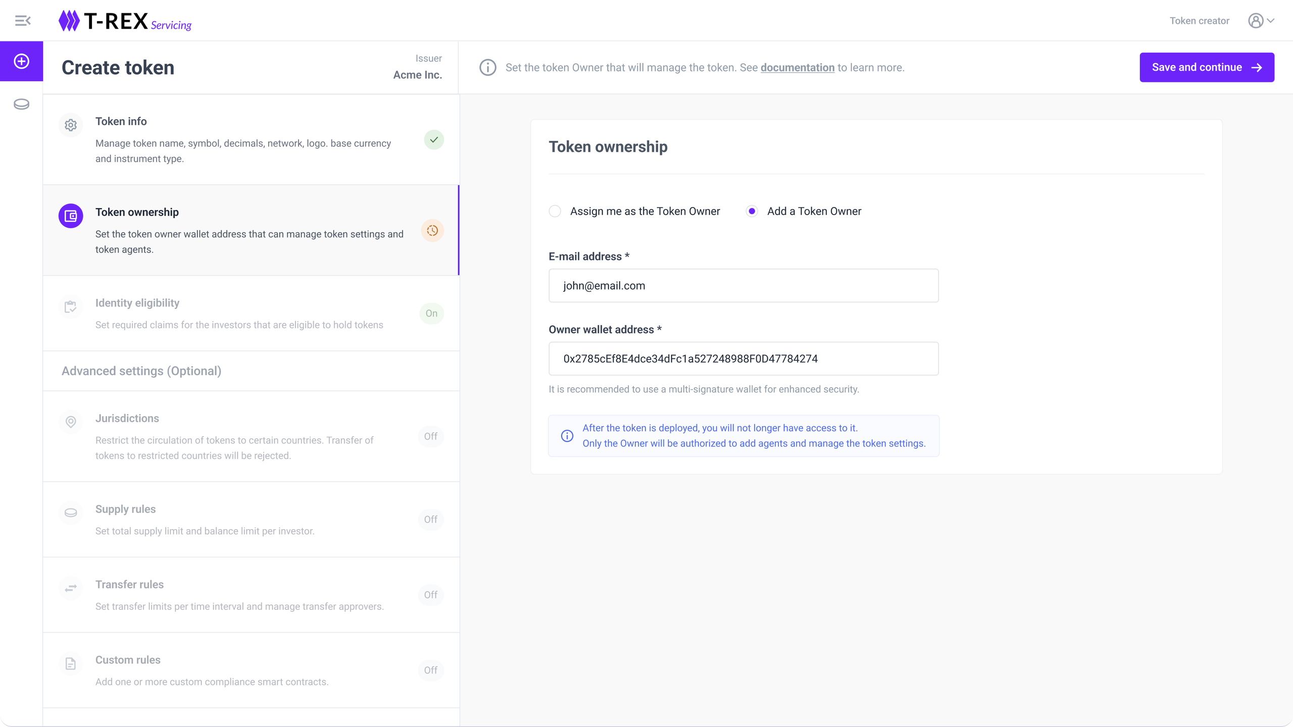 The Owner Wallet Address is the sole authorized wallet capable of adding agents to the token and managing its settings. This privileged role ensures that only authorized parties can administer critical aspects of the token's functionality, including governance, permissions, and operational configurations.