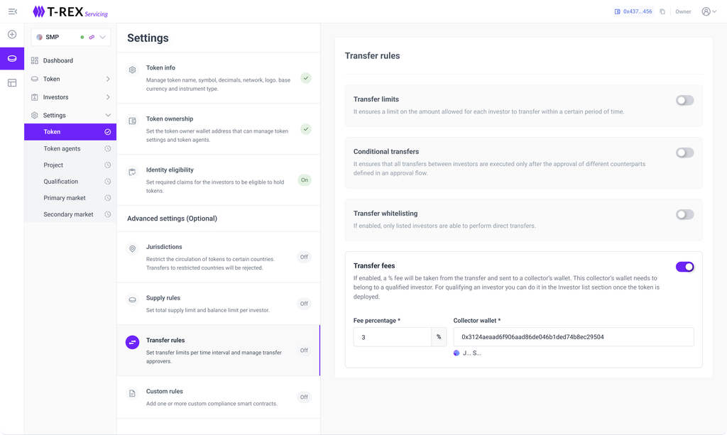 - Fee Percentage: The fee is calculated as a percentage of the transfer amount and can be customized according to different investor profiles or transaction types.